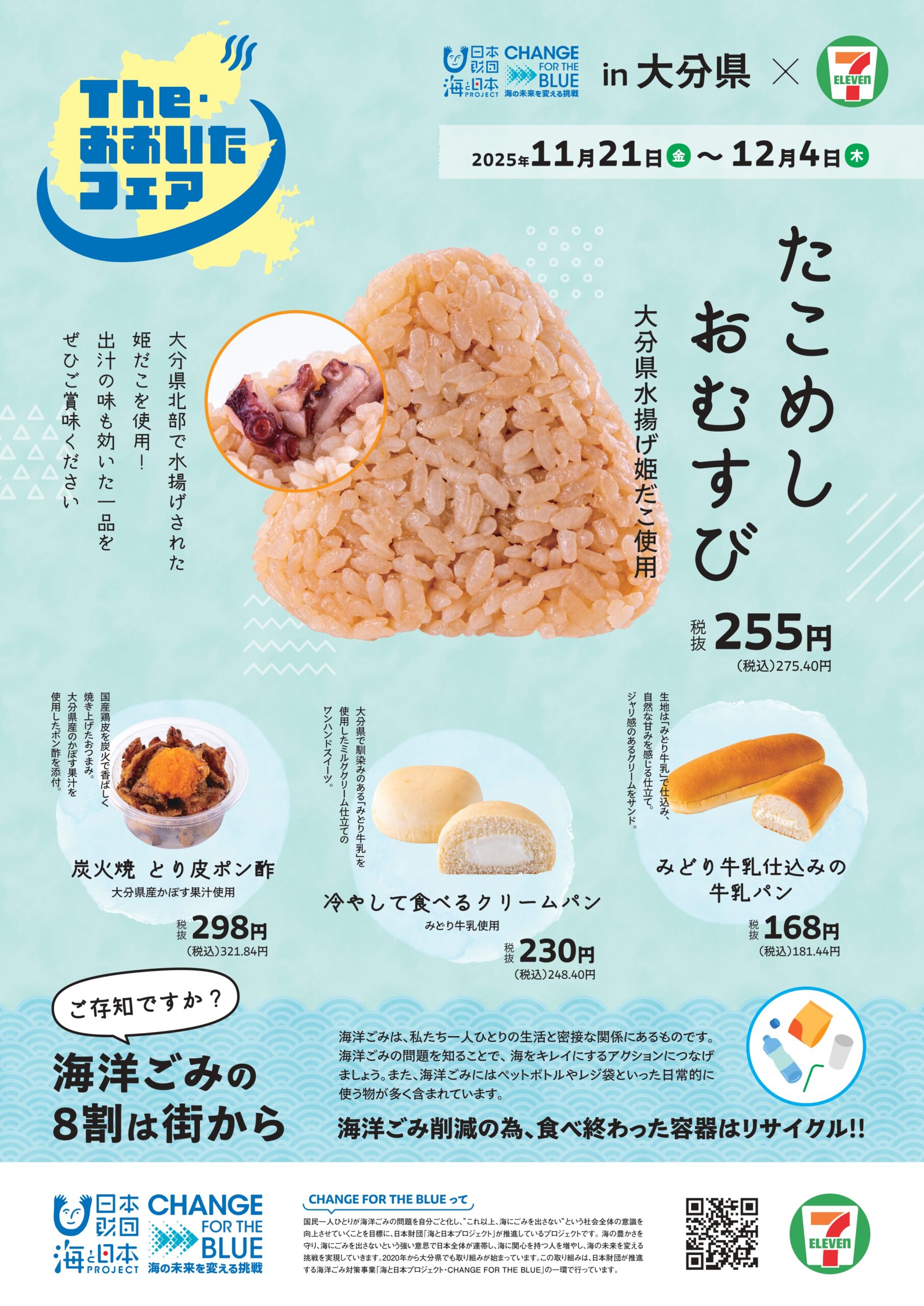 若者の魚離れや地域課題の解決に向けた取り組みの一環として、(株)セブン‐イレブン・ジャパンとタイアップし、2025年11月21日(金)より期間限定で大分県内のセブン‐イレブン全店舗で「たこめしおむすび」を発売いたします。