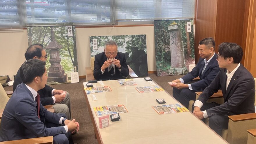 表敬訪問の場では、商品販売に至るまでのプロジェクトの経緯・具材選定理由などをお伝えし、海洋問題への理解を深めていただくことができました。また、国東市松井市長・大分県庁農林水産部の方々がたこめしおむすびを実食し、「とても美味しい」と好評をいただいたのと同時に、地域活性化へのご意見なども頂きとても有意義な時間となりました。
