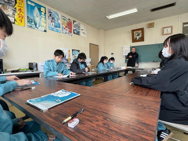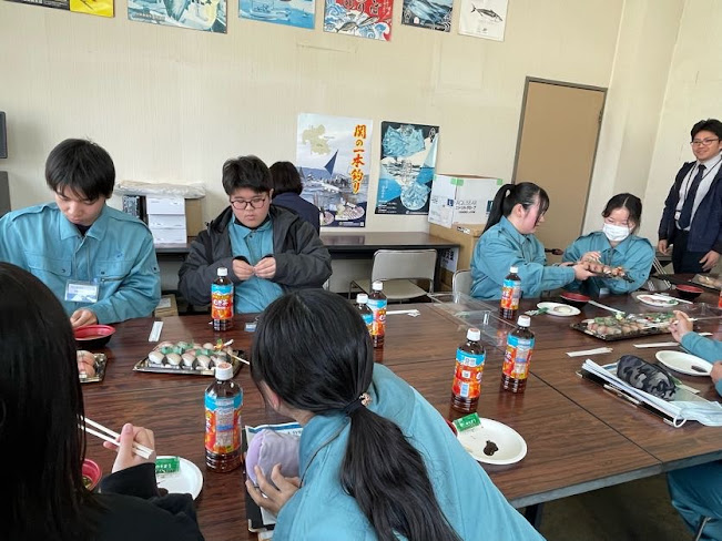 続いて大分県漁業協同組合佐賀関支店にて佐藤支店長と同校のOBである職員の須川さんからお話を伺いました。今回は進路選択を控えた2年生がメインの参加ということもあり、将来のキャリアを具体的にイメージできる貴重な時間となりました。お昼は須川さんの神経締めしたお魚でお寿司をいただき「今まで食べたものと全然違う!」と感激し、技術の価値を実感する特別な体験となりました。また、この日はクロメ漁の解禁日ということもあり、今でしか見られない貴重なクロメ漁の見学もさせていただきました。