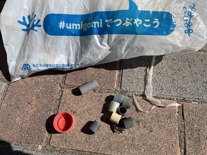 拾った海洋ごみの多くは、ペットボトルのキャップや釣り具の破片、流れ着いた小さなプラスチックごみでした。海に詳しい方に話を伺うと、海洋ごみが漂流し浜辺に流れ着いているとのことでした。一度川や海へ流れ出たプラスチックは、自然の力で砕かれ、二度と元の形には戻りません。紙や流木のように土に還ることはなく、ただ「チップ」として残り続け砂浜と一体化してしまうのが現状です。小さなプラスチックは回収が困難な状態でしたが、こうした微細なごみも地道に拾い集め、イベントを通して海洋ごみ削減に向け環境を見直す大切な学びの機会となりました。