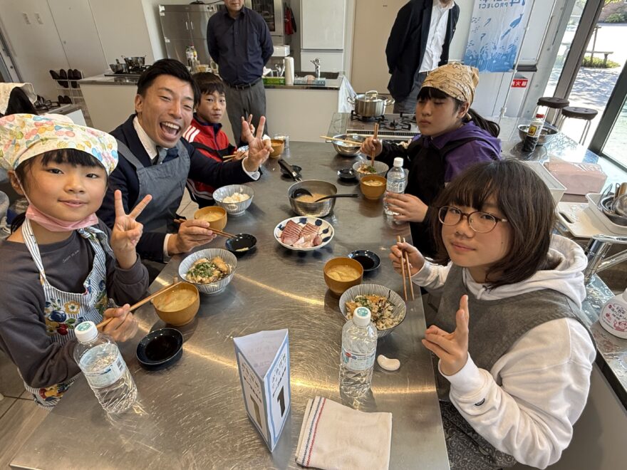 一般社団法人うみらいふは、2025年11月15日(土)に、大分県内在住の小学4~6年生を対象とした料理教室「別府ちゃんと学ぶ!お魚探検クッキング」(第2弾)を実施しました。本プロジェクトは、魚離れが進む中で、子どもたちに“魚をもっと好きに、もっと食べてほしい”という思いのもと、新しい定番メニューの開発・普及を目指す取り組みです。今回の料理教室では、日本酒の酒粕で育てたブランド魚「美人鰤(びじんぶり)」を使用し、「つるりんブリのぶっかけ丼」を開発しました。普段、刺身や寿司でしかブリを食べたことがない子どもたちは、“つるん”と食べられる新たな食感に驚きながらも、楽しそうに味わっていました。また、大分県水産養殖協議会の福田穣(ふくだ ゆたか)氏を講師に迎え、「養殖魚がどのように育てられるのか」「どんな種類があるのか」などについて学ぶ時間を設け、子どもたちにとって楽しく学べる機会となりました。