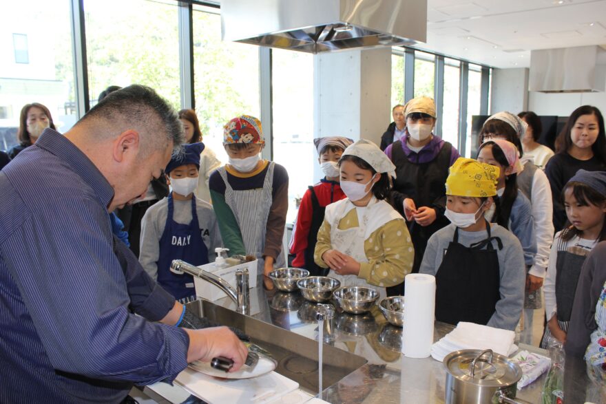 調理に入る前に、魚捌きのプロである塩脇(しおわき)氏にブリの解体ショーを披露して頂きました。ブリ1本を捌く様子を見たことがない子ども達がほとんどで、塩脇さんの見事な包丁さばきに見入っている様子でした。園田先生から「つるりんブリのぶっかけ丼」の作り方を教わった後、班ごとに分かれて調理にチャレンジしました。慣れない包丁に悪戦苦闘しながらもみんなで協力しあって料理を完成させ、自分達で作った料理の美味しさは格別のようで「美味しい!」といった声がたくさん上がっていました。今回の料理教室は、子ども達にとって魚への関心や料理の楽しさを学ぶ良い機会となりました。